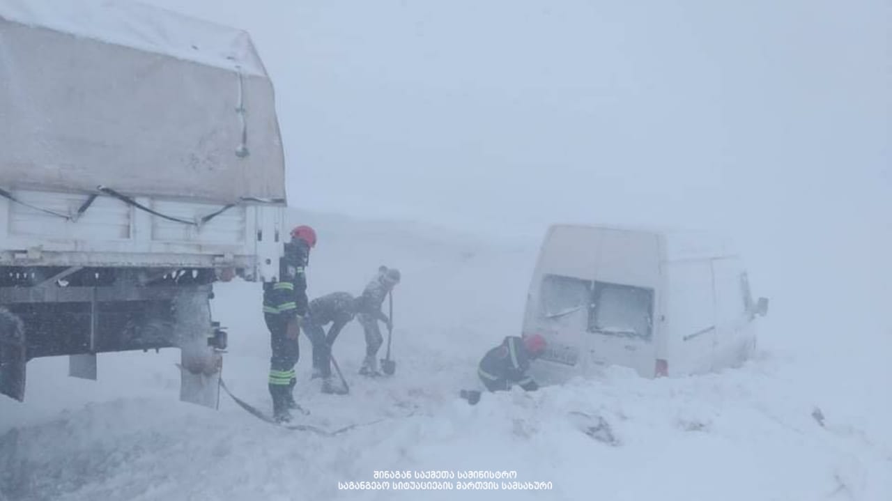 მეხანძრე-მაშველები გოდერძის უღელტეხილზე, დიდთოვლობის გამო ჩარჩენილ მოქალაქეებს ეხმარებიან