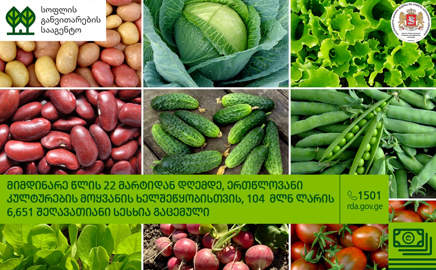 მიმდინარე წლის 22 მარტიდან დღემდე, ერთწლოვანი კულტურების მოყვანის ხელშეწყობისთვის, 104 მლნ ლარის 6,651 შეღავათიანი სესხია გაცემული