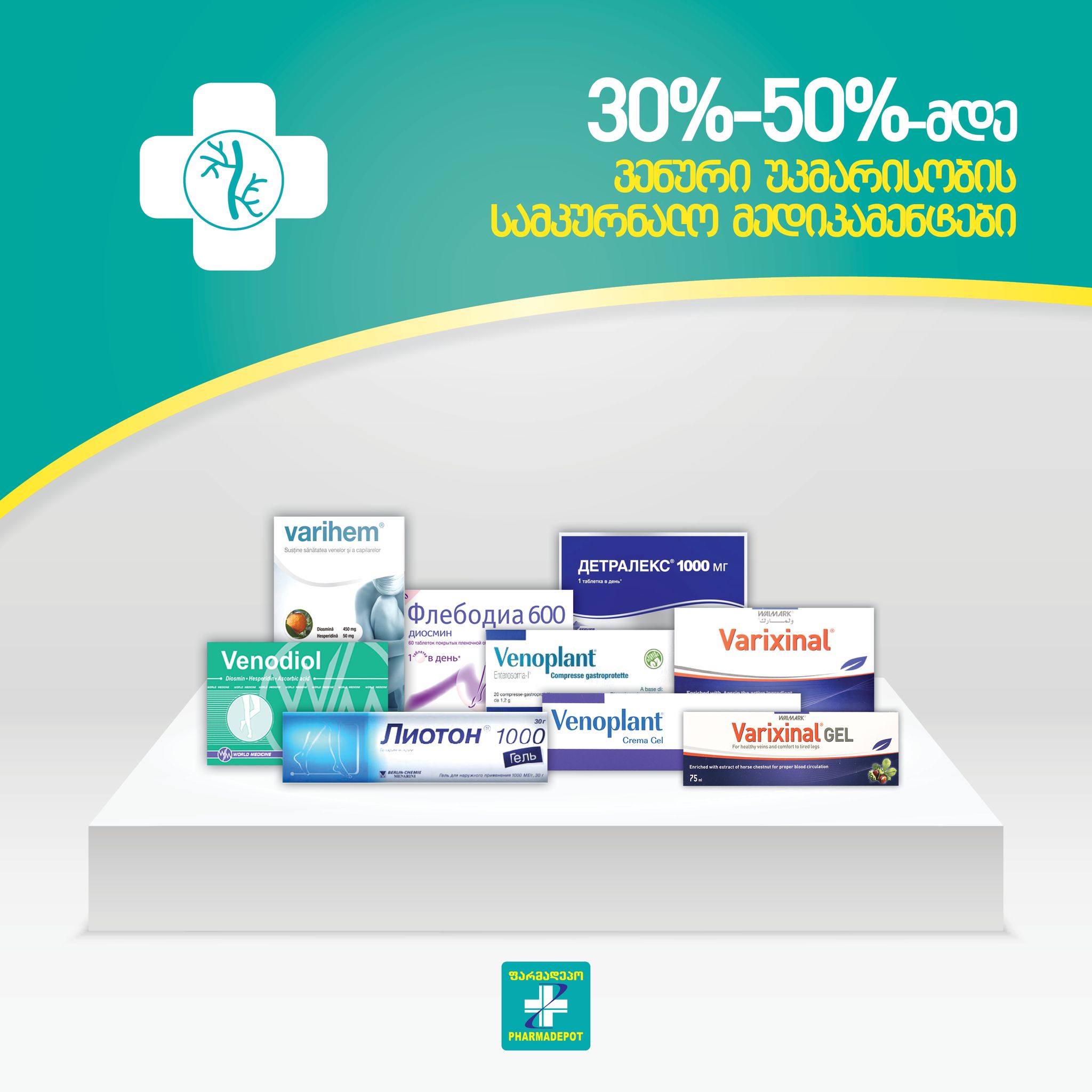 „ფარმადეპოში“ ვენური უკმარისობის სამკურნალო მედიკამენტებზე 30-50% ფასდაკლებაა