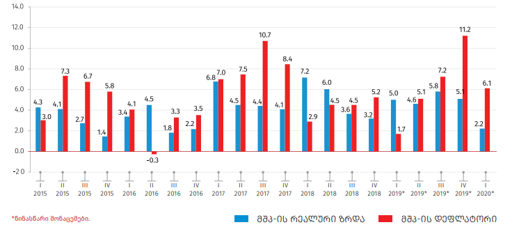 2020 წლის I კვარტალში მთლიანი შიდა პროდუქტის მოცულობა, წინა წლის ანალოგიურ მაჩვენებელთან შედარებით, 2.2%-ით გაიზარდა