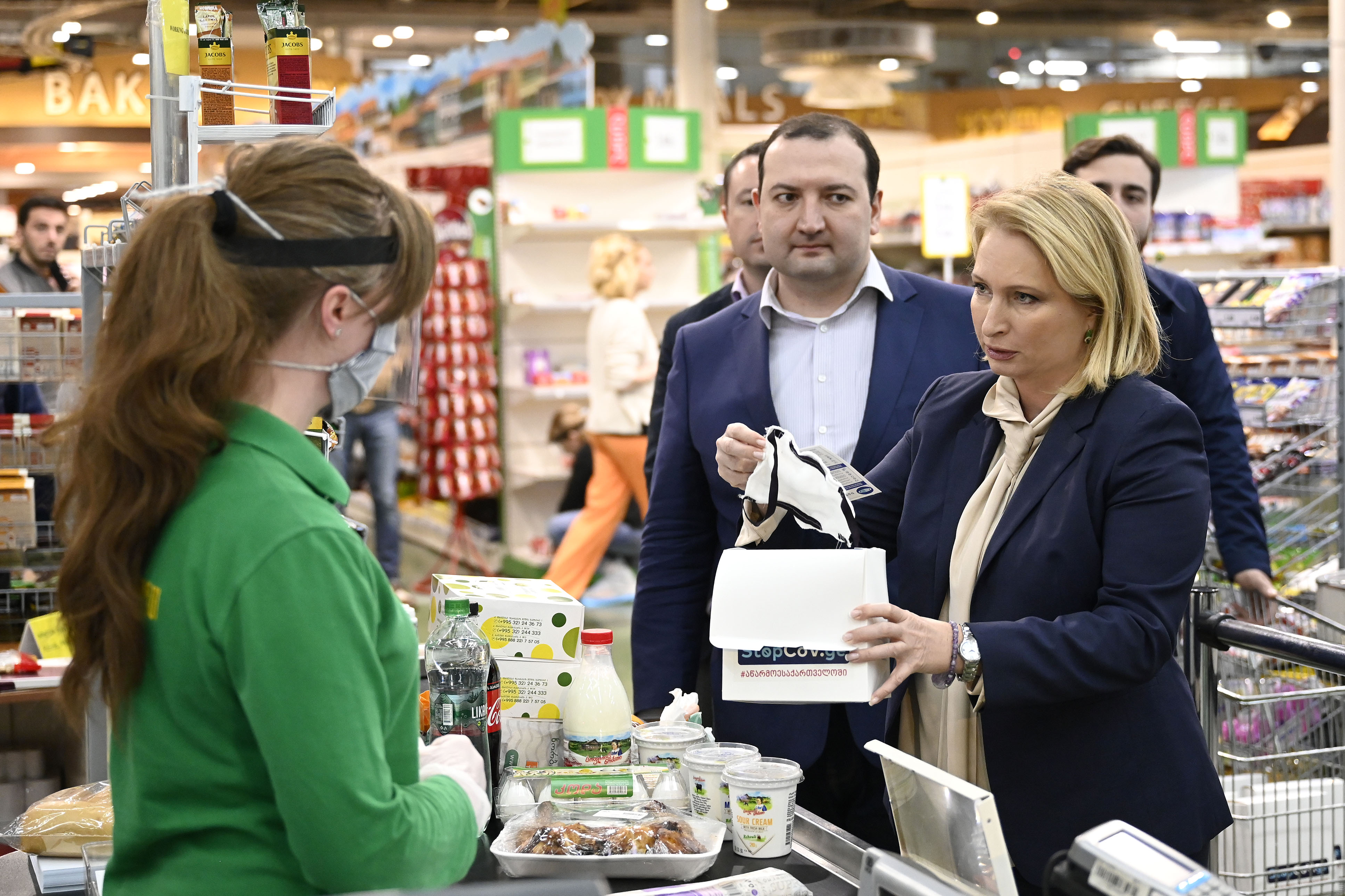 ნათია თურნავა სასურსათო მაღაზიების თანამშრომლებისთვის ქართული წარმოების პირბადეების დარიგების პროცესს დაესწრო