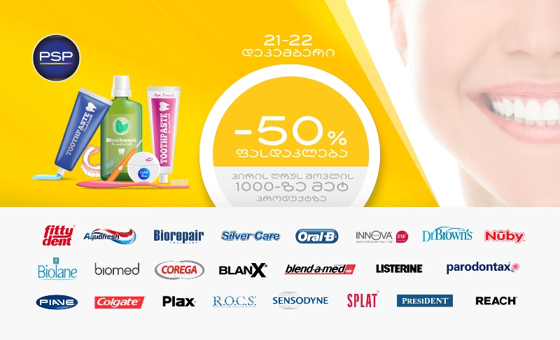 50%-იანი ფასდაკლება პირის ღრუს მოვლის საშუალებებზე 21 და 22 დეკემბერს - PSP მომხმარებლისადმი მადლიერების კაპმანიას აგრძელებს