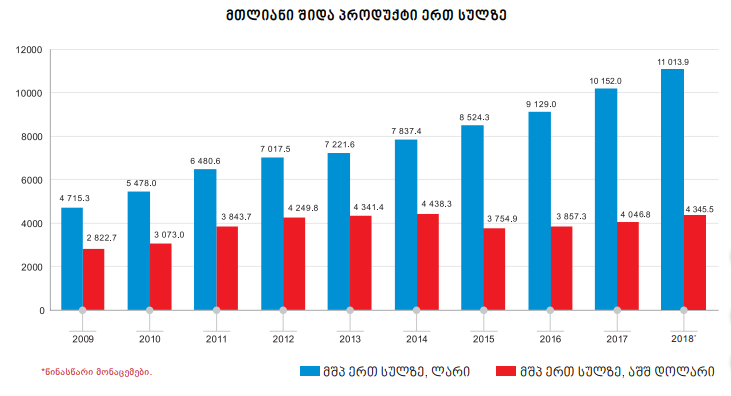 2018 წელს მთლიანი შიდა პროდუქტის მოცულობამ მიმდინარე ფასებში 41 077.5 მილიონი ლარი შეადგინა