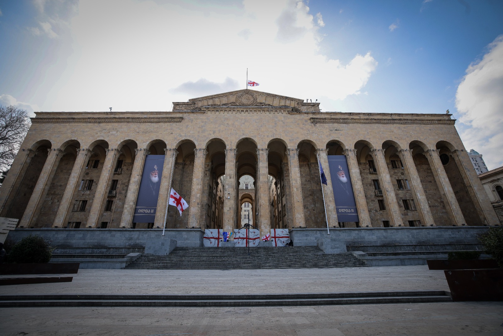 პარლამენტის შენობაზე პატრიარქის, ილია II-ის ფოტოები გამოფინეს