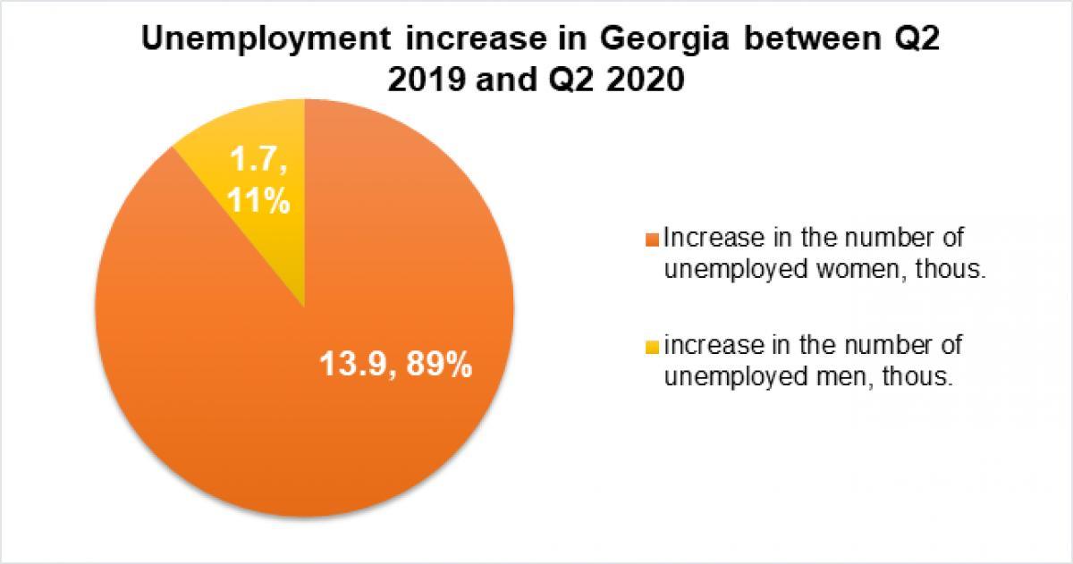 ეკონომიკის საერთაშორისო სკოლა კვლევას აქვეყნებს, რომლის თანახმადაც, 2020 წლის II კვარტალში სამსახური 15 600 ადამიანმა დაკარგა, მათგან 89% ქალია, 11% კი კაცი. კვლევის თანახმად, აღნიშნულ პერიოდში ეკონომიკამ საერთო ჯამში 43,8 ათასი დაქირავებული მუშა დაკარგა. დამატებით 9.600 ადამიანი კი თვითდასაქმებული გახდა. „უმუშევრობის დონე არ გაიზარდა მკაცრი ჩაკეტვის, მოგზაურობის სხვადასხვა შეზღუდვებისა და საკარანტინო ზომების ფონზე. ეკონომიკამ საერთო ჯამში 43,8 ათასი დაქირავებული მუშა დაკარგა. დამატებით 9.600 ადამიანი გახდა თვითდასაქმებული, ხოლო 15,6 ათასი ადამიანი შეუერთდა უმუშევართა რიგებს. მეორე კვარტალში 15,6 ათასი ახალი უმუშევრიდან 13,9 ათასი (89%) ქალი იყო, ხოლო 1,7 ათასი (11%) კაცი. წინა წლის ანალოგიურ მაჩვენებელთან შედარებით, მამაკაცთა უმუშევრობის დონე მხოლოდ 0,1 პროცენტული პუნქტით გაიზარდა, ხოლო ქალთა უმუშევრობის დონე 1,8 პროცენტული პუნქტით. ადვილი მისახვედრია, რომ ქალთა უმუშევრობის დონემ, რომლებმაც წინა კვარტალებში კლების ტენდენცია გამოავლინეს, COVID-19-ის პერიოდში მნიშვნელოვანი ზრდა განიცადა. მონაცემები ასევე გვეუბნება, რომ 2020 წლის II კვარტალში 9,6 ათასი დამატებითი თვითდასაქმებულიდან 95%, ანუ 9,1 ათასი ქალი იყო. 43.8 ათასი დაქირავებული თანამშრომელი, რომლებმაც დაკარგეს სამუშაო, უმეტესწილად ქალები იყვნენ (99%)“, - ვკითხულობთ კვლევაში.