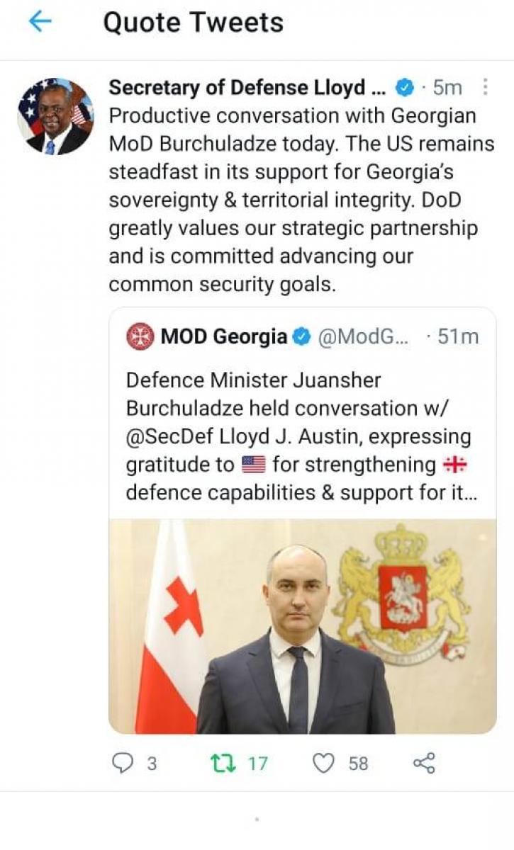 აშშ-ს თავდაცვის მდივანი ლოიდ ოსტინი საქართველოს თავდაცვის მინისტრთან, ჯუანშერ ბურჭულაძესთან გამართულ სატელეფონო საუბარს საკუთარ ტვიტერზე გამოეხმაურა
