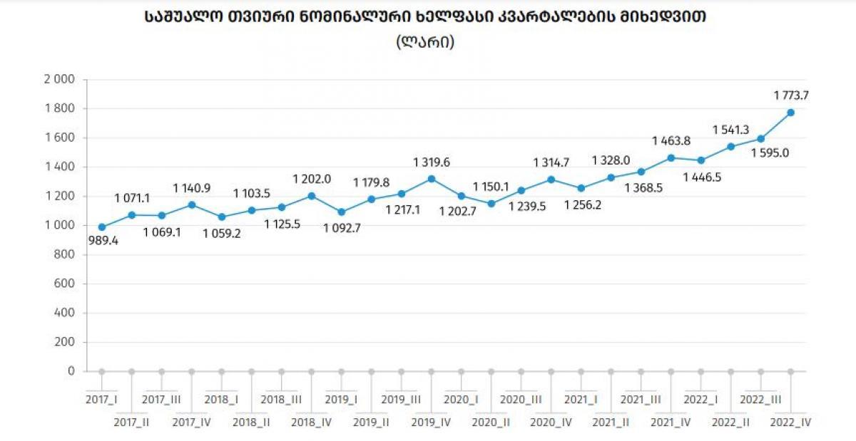 საქსტატი - 2022 წლის IV კვარტალში საქართველოში საშუალო ხელფასი 309 ლარით გაიზარდა და 1 773 ლარი შეადგინა