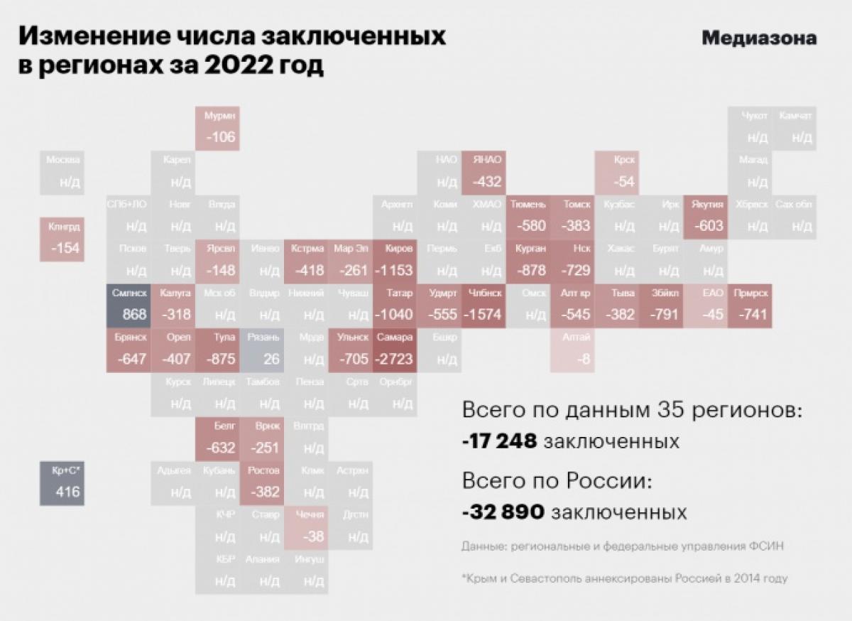 უკრაინაში ომის დროს, რუსეთის ციხეებიდან 17 ათასი პატიმარი გაუჩინარდა. აღნიშნულის შესახებ ინფორმაციას გამოცემა Медиазона ავრცელებს. გამოცემამ მონაცემები ფედერალური სასჯელაღსრულების სამსახურის 35 რეგიონული დეპარტამენტის ვებსაიტებზე აღმოაჩინა - 2023 წლის დასაწყისისთვის ამ რეგიონებში პატიმართა რაოდენობა, ჯამში, 17 000-ით შემცირდა. „არც ფედერალური სასჯელაღსრულების სამსახური, არც პრიგოჟინი და არც თავდაცვის სამინისტრო არ აქვეყნებდნენ ოფიციალურ მონაცემებს ომის დროს გაყვანილი პატიმრების რაოდენობის შესახებ. დაქირავებულების რაოდნეობა შეიძლება შეფასდეს ციხეში მყოფთა სტატისტიკით, მაგრამ ფედერალურმა სასჯელაღსრულების სამსახურმა გარკვეული დროით შეწყვიტა მისი გამოქვეყნება, ხოლო იანვარში განაცხადეს, რომ პატიმრების რაოდენობა აღარ იკლებს“,- წერს გამოცემა. გამოცემის ცნობითვე, პატიმრების უმეტესობა გაუჩინარდა სამარაში (2 723), ჩელიაბინსკში (1 574), კიროვის რეგიონებში (1 153) და ტატარსანში (1 040). ამასთან, გამოცემა იუწყება, რომ შეგროვებული მონაცემები არასრულია და უცნობია, რამ განაპირობა სმოლენსკის რეგიონში და ოკუპირებულ ყირიმში პატიმრების რაოდენობის ზრდა, ვინაიდან ახალი კოლონიების შესახებ ინფორმაცია არ ყოფილა.