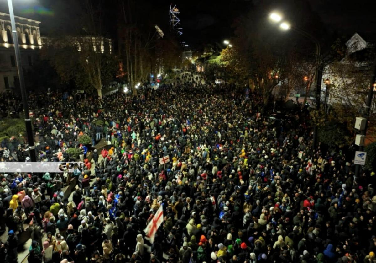 30 ოქტომბერს ევროკომისიამ ევროკავშირის გაფართოების შესახებ ყოველწლიური ანგარიში გამოაქვეყნა. დოკუმენტის მიხედვით, მთავრობის მიერ გასული წლის განმავლობაში გადადგმული ნაბიჯების, განსაკუთრებით უცხოური გავლენების შესახებ კანონის მიღების გამო ამჟამად საქართველოს ევროკავშირში გაწევრიანების პროცესი დე ფაქტოდ შეჩერებულია. ნოემბერი მიუხედავად იმისა, რომ ქართული ოცნების ლიდერების მტკიცებით, "ევროინტეგრაცია არც შეჩერებულა და ვერც შეჩერდება", ნოემბერი ის თვეა, როცა ქართულმა ოცნებამ უკვე თავადვე, ოფიციალურად შეაჩერა ოთხი წლით, 2028 წლის ბოლომდე ევროკავშირთან მოლაპარაკებების გახსნა. თვე არჩევნების შედეგების გაპროტესტებით და სასამართლოებით დაიწყო. საიას სარჩელი, გაებათილებინა შედეგები, რადგან მარკერის გაჟონვის გამო დაირღვა ხმის ფარულობა, ხოლოდ თეთრიწყაროს სასამართლოს მოსამართლე ვლადიმერ ხუჭუამ დააკმაყოფილა. თუმცა, სააპელაციომ მისი გადაწყვეტილებაც გააუქმა. სამი ოპოზიციური პარტია წინააღმდეგობის მსვლელობებზე შეთანხმდა და განაცხადა, რომ ყოველდღე ექნებოდათ მსვლელობები. პარალელურად, კოალიცია ცვლილებისთვის ლიდერმა ნიკა გვარამიამ კარვების შეგროვება დაიწყო. მათგან დამოუკიდებლად სხვადასხვა უნივერსიტეტში დაიწყო სტუდენტების პროტესტი. სტუდენტები პროტესტის ნიშნად შენობაში დარჩენას ცდილობდნენ. ხშირ შემთხვევაში, მათ ეს უფლება ეზღუდებოდათ. გერმანიამ საქართველოს მიმდინარე პოლიტიკის გამო, რამდენიმე მსხვილი სამხედრო პროექტი გააუქმა. ასევე, აშშ-ში "ქართველი ხალხის აქტის" ორპარტიულ კანონპროექტს კიდევ 10 მხარდამჭერი სენატორი დაემატა. ევროკავშირის უმაღლესმა წარმომადგენელმა, ჯოზეფ ბორელმა თქვა, რომ შეწყვეტდნენ დახმარების პროგრამებს, რომლებიც საქართველოს მთავრობასთან მიდის. მისი ცნობით, გაიყინება 100 მილიონ ევროზე მეტი და მთავრობის ნაცვლად, საქართველოს სამოქალაქო საზოგადოების ორგანიზაციებს მიეწოდება. ასევე, 18 ნოემბერს ჯოზეფ ბორელმა თქვა, რომ ევროკავშირის ტექნიკური მისია საქართველოში ჩამოვიდოდა და 26 ოქტომბრის საპარლამენტო არჩევნებში გამოვლენილ დარღვევებს შეისწავლიდა. ამას ირაკლი კობახიძემ უპასუხა, რომ “ტექნიკურ მისიას ჩვენგანაც დახვდება ტექნიკური ჯგუფი”. პრეზიდენტმა ხმის ფარულობისა და არჩევნების საყოველთაობის დარღვევის შესახებ საკონსტიტუციო სარჩელი შეიტანა. მმართველი გუნდი წინასწარ და "დაზუსტებით" ამბობდა, რომ სარჩელის დაკმაყოფილების "შანსი არ იყო". არასამთავრობო ორგანიზაციების და კონსტიტუციონალისტების შეფასე