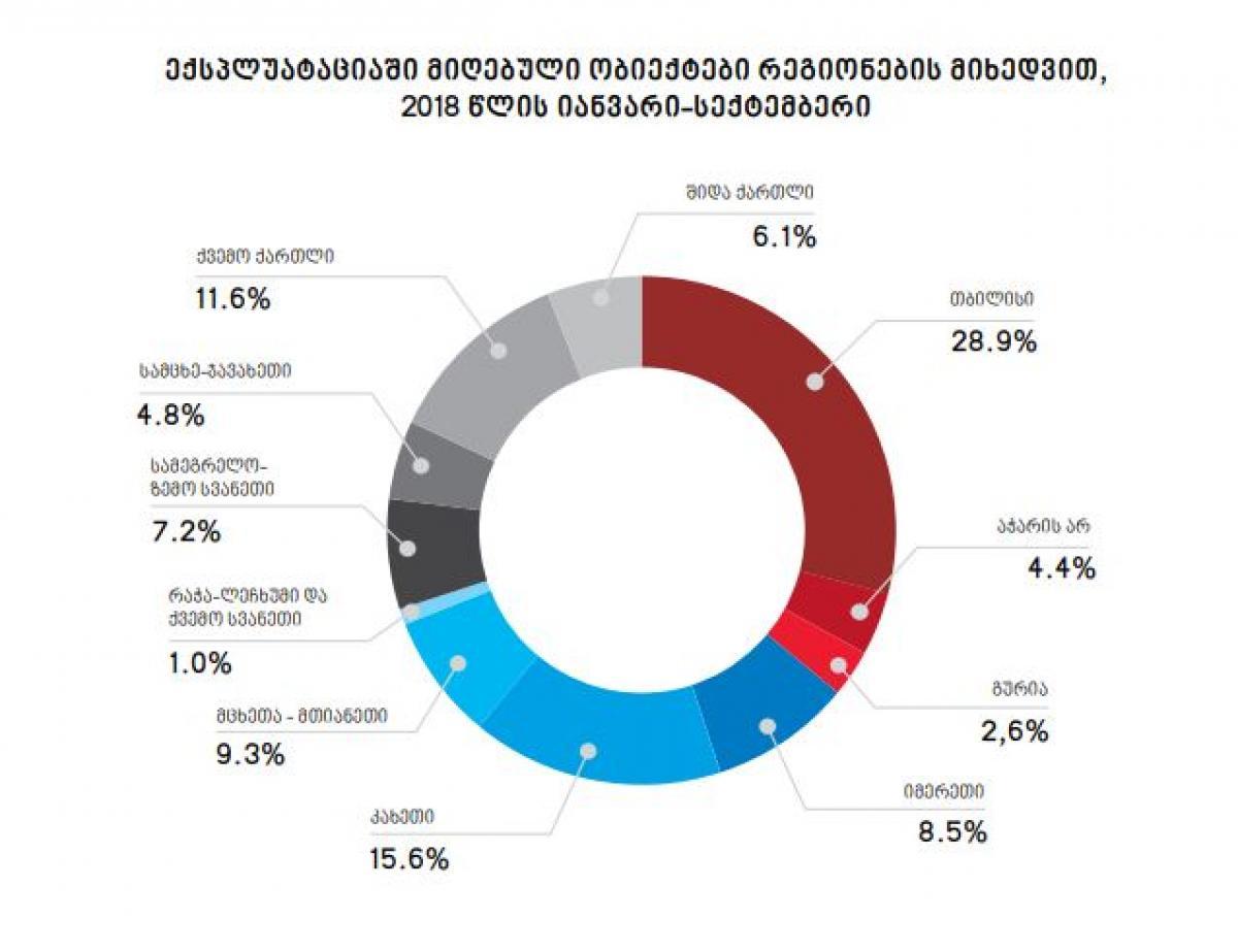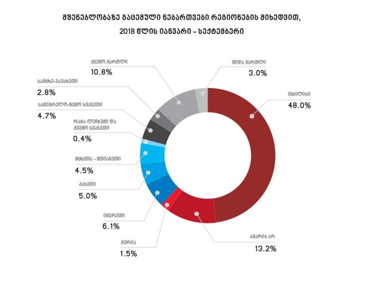 სტატისტიკის ეროვნული სამსახურის ინფორმაციით, ოფიციალური დეკლარირებული მონაცემების თანახმად, საქართველოში 2018 წლის იანვარ-სექტემბერში გაცემულია 7 702 ნებართვა, რაც გასული წლის შესაბამის პერიოდთან შედარებით 4,6 პროცენტით ნაკლებია. ამასთან, საქსტატის ცნობით, ნებართვები გაცემულია 4 536,9 ათასი კვ.მ ფართობის შენობა-ნაგებობების მშენებლობაზე (გასული წლის შესაბამის პერიოდთან შედარებით 10,2 პროცენტით ნაკლები). ნებართვების 72,0 პროცენტი გაცემულია ქვეყნის 3 რეგიონში, კერძოდ: ჩასატარებელი სამშენებლო სამუშაობის 48,0 პროცენტი თბილისშია, 13,2 პროცენტი – აჭარის ა.რ.-ში და 10,8 პროცენტი – ქვემო ქართლის რეგიონში. „უნდა აღინიშნოს, რომ 2018 წლის იანვარ-სექტემბერში ნებართვები გაიცა მრავალფუნქციური საცხოვრებელი კომპლექსების, სასტუმროების, სავაჭრო ობიექტების, სამრეწველო საწარმოების, სასოფლო-სამეურნეო დანიშნულების ობიექტებისა და სხვა შენობა - ნაგებობების მშენებლობაზე. გაცემულ ნებართვებში შედარებით დიდი წილით წარმოდგენილია მრავალფუნქციური საცხოვრებელი კომპლექსები“, - აცხადებენ საქსტატში. დამთავრებული მშენებლობების ნახევარზე მეტი 56,1 პროცენტი ქვეყნის 3 რეგიონზეა განაწილებული, კერძოდ: 28,9 პროცენტი მოდის ქ. თბილისზე, 15,6 პროცენტი – კახეთის რეგიონზე, ხოლო 11,6 პროცენტი - ქვემო ქართლის რეგიონზე. 2018 წლის იანვარ-სექტემბერში ექსპლუატაციაში მიღებულ იქნა 1453,5 ათასი კვ.მ ფართობის 1830 ობიექტი, რაც 15,9 პროცენტით ჩამორჩება წინა წლის შესაბამის პერიოდის მაჩვენებელს.