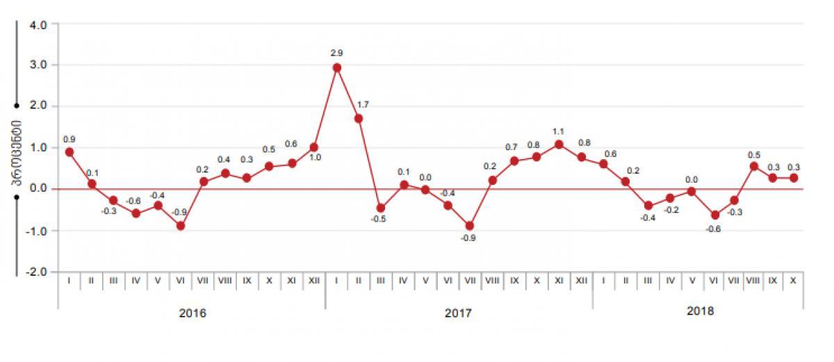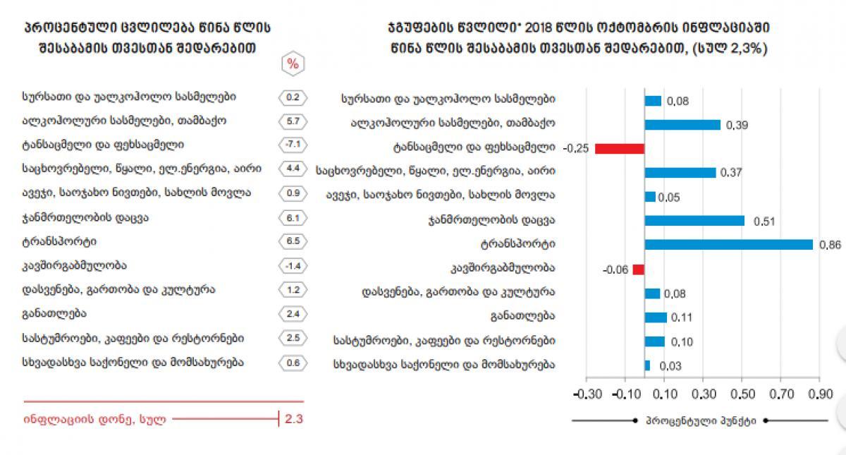 სტატისტიკის ეროვნული სამსახურის ინფორმაციით, 2018 წლის ოქტომბერში წინა თვესთან შედარებით ინფლაციის დონემ საქართველოში 0,3 პროცენტი, ხოლო წლიური ინფლაციის დონემ 2,3 პროცენტი შეადგინა.