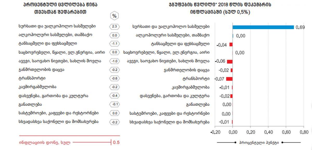 2018 წლის დეკემბერში წინა თვესთან შედარებით ინფლაციის დონემ საქართველოში 0,5 პროცენტი შეადგინა, ხოლო წლიური ინფლაციის დონე 1,5 პროცენტით განისაზღვრა. ამის შესახებ „ექსპრესნიუსს“ სტატისტიკის ეროვნული სამსახურიდან აცნობეს. საქსტატის ინფორმაციით, წლიური ინფლაციის ფორმირებაზე ძირითადი გავლენა იქონია ფასების ცვლილებამ შემდეგ ჯგუფებზე: სურსათის და უალკოჰოლო სასმელების ჯგუფში ფასები გაიზარდა 1,7 პროცენტით, რაც წლიურ ინფლაციაზე 0,52 პროცენტული პუნქტით აისახა. ფასები მომატებულია შემდეგ ქვეჯგუფებზე: თევზეული (11,1 პროცენტი), პური და პურპროდუქტები (8,8 პროცენტი), ხორცი და ხორცის პროდუქტები (4,5 პროცენტი). ამასთან, ფასები შემცირდა ქვეჯგუფებზე: ხილი და ყურძენი (-17,5 პროცენტი), შაქარი, ჯემი და სხვა ტკბილეული (-4,3 პროცენტი), ასევე ბოსტნეული და ბაღჩეული (-3,2 პროცენტი); ალკოჰოლური სასმელები, თამბაქო - ფასები გაიზარდა 4,9 პროცენტით, რაც 0,33 პროცენტული პუნქტით აისახა წლიური ინფლაციის მთლიან მაჩვენებელზე. ფასები მომატებულია თამბაქოს ნაწარმზე (8,1 პროცენტი); საცხოვრებელი, წყალი, ელ. ენერგია, აირი - ფასები გაიზარდა 3,1 პროცენტით. შესაბამისად, ჯგუფის წვლილმა წლიურ ინფლაციაში 0,25 პროცენტული პუნქტი შეადგინა. ფასები მომატებულია წყალმომარაგებისა და საცხოვრებელთან დაკავშირებული სხვა მომსახურების (7,7 პროცენტი), ასევე ელექტროენერგიის, აირის და სათბობის სხვა სახეების (2,9 პროცენტი) ქვეჯგუფებზე; ჯანმრთელობის დაცვა: ფასები მომატებულია 2,9 პროცენტით, რაც 0,25 პროცენტული პუნქტით აისახა მთლიანი ინდექსის ზრდაში. ფასები გაიზარდა ქვეჯგუფებზე: სამედიცინო პროდუქცია, აპარატურა და მოწყობილობა (4,0 პროცენტი), ამბულატორიული სამედიცინო მომსახურება (3,4 პროცენტი) და საავადმყოფოების მომსახურება (1,1 პროცენტი); ტრანსპორტი: ჯგუფში დაფიქსირდა ფასების 1,7 პროცენტიანი მატება, რაც წლიურ ინფლაციაზე 0,22 პროცენტული პუნქტით აისახა. ფასები გაიზარდა პირადი სატრანსპორტო საშუალებების ექსპლუატაციაზე (3,4 პროცენტი).