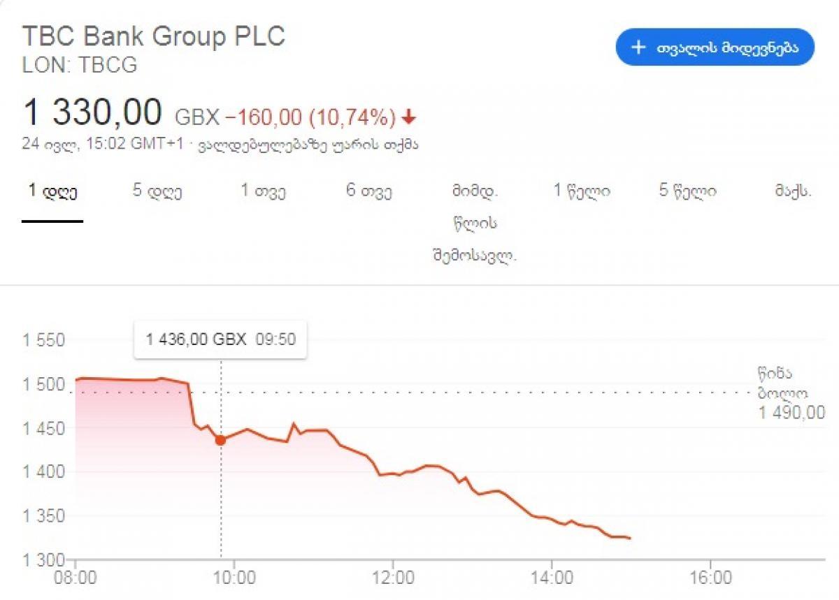 პროკურატურის განცხადების შემდეგ, ლონდონის ბირჟაზე TBC ბანკის აქციები მკვეთრად გაუფასურდა