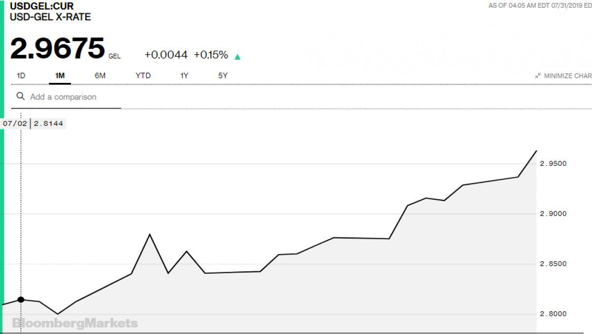 Bloomberg-ის ელექტრონულ სავაჭრო სისტემაში დღევანდელი დღის მონაცემებით, ეროვნული ვალუტა დოლართან მიმართებაში გაუფასურდა და მისი შეძენა 2.9675 ლარად არის შესაძლებელი. გამოცემის ვებგვერდზე განთავსებული ინფომრაციის თანახმად, დღიური მაჩვენებელი ასე გამოიყურება: 2.9300 - 2.9713. გამოცემის ინფორმაციით, Bloomberg-ზე ვაჭრობა დღეს, 1 დოლარი 2.9643 კურსით დაიწყო და 0.78%-იანი გაუფასურება ფიქსირდება. ცნობისთვის, თბილისის დროით 12:00 საათზე 1 დოლარის ღირებულება Bloomberg-ზე 2.9675 ლარია, გუშინ კი, მისი შეძენა 2.9631 კურსით იყო შესაძლებელი და ამავე კურსით დასრულდა. Bloomberg-ის სისტემაში შეთავაზებების ფასის მიხედვით, ივლისის თვის მაჩვენებელი ასე გამოიყურება: ლარი დოლართან მიმართებაში 2.8094-დან 2.9625-მდე მერყეობდა. ცნობისთვის, ეროვნული ბანკის მიერ დადგენილი ლარის ახალი ოფიციალური გაცვლითი კურსის თანახმად, 1 დოლარი დღეს, 2.9507 ლარი ღირს. რაც შეეხება ევროს, 1 ევროს შეძენა, 3.2889 ლარად არის შესაძლებელი. საქართველოს კომერციულ ბანკებში ერთი დოლარის ღირებულება 2.98-დან 3.01 ლარამდე მერყეობს, ევროს ფასი კი, 3.34 -3.38 ლარია.