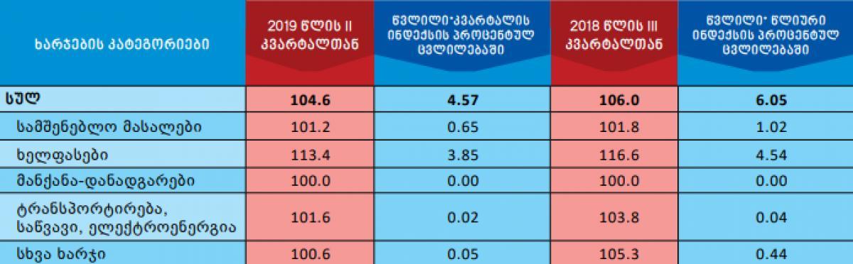 სტატისტიკის ეროვნული სამსახურის ინფორმაციით, მშენებლობის ღირებულების ინდექსი წინა კვარტალთან შედარებით 4.6 პროცენტით გაიზარდა. საქსტატის ცნობით, აღნიშნული ცვლილება განპირობებული იყო სამეწარმეო სფეროში მშენებლობის დარგში დაქირავებით დასაქმებულთა საშუალო თვიური ნომინალური ხელფასის 13.4 პროცენტიანი მატებით, რამაც 3.85 პროცენტული პუნქტით მოახდინა ზეგავლენა მთლიან ინდექსზე. „წინა წლის შესაბამის კვარტალთან შედარებით მშენებლობის ღირებულების ინდექსი გაიზარდა 6.0 პროცენტით. ინდექსის ზრდა, ძირითადად, გამოწვეული იყო მშენებლობის დარგში დაქირავებით დასაქმებულთა საშუალო თვიური ნომინალური ხელფასის 16.6 პროცენტიანი ზრდით, რაც 4.54 პროცენტული პუნქტით აისახა მთლიანი ინდექსის ცვლილებაზე“, - ნათქვამია საქსტატის ინფორმაციაში. ქვემოთ მოცემულ ცხრილში წარმოდგენილია 2019 წლის მესამე კვარტალში მშენებლობის ღირებულების ინდექსი წინა კვარტალთან და წინა წლის შესაბამის კვარტალთან შედარებით, ასევე ინდექსის ფორმირებაში მონაწილე ხარჯების კატეგორიების შესაბამისი წვლილები:
